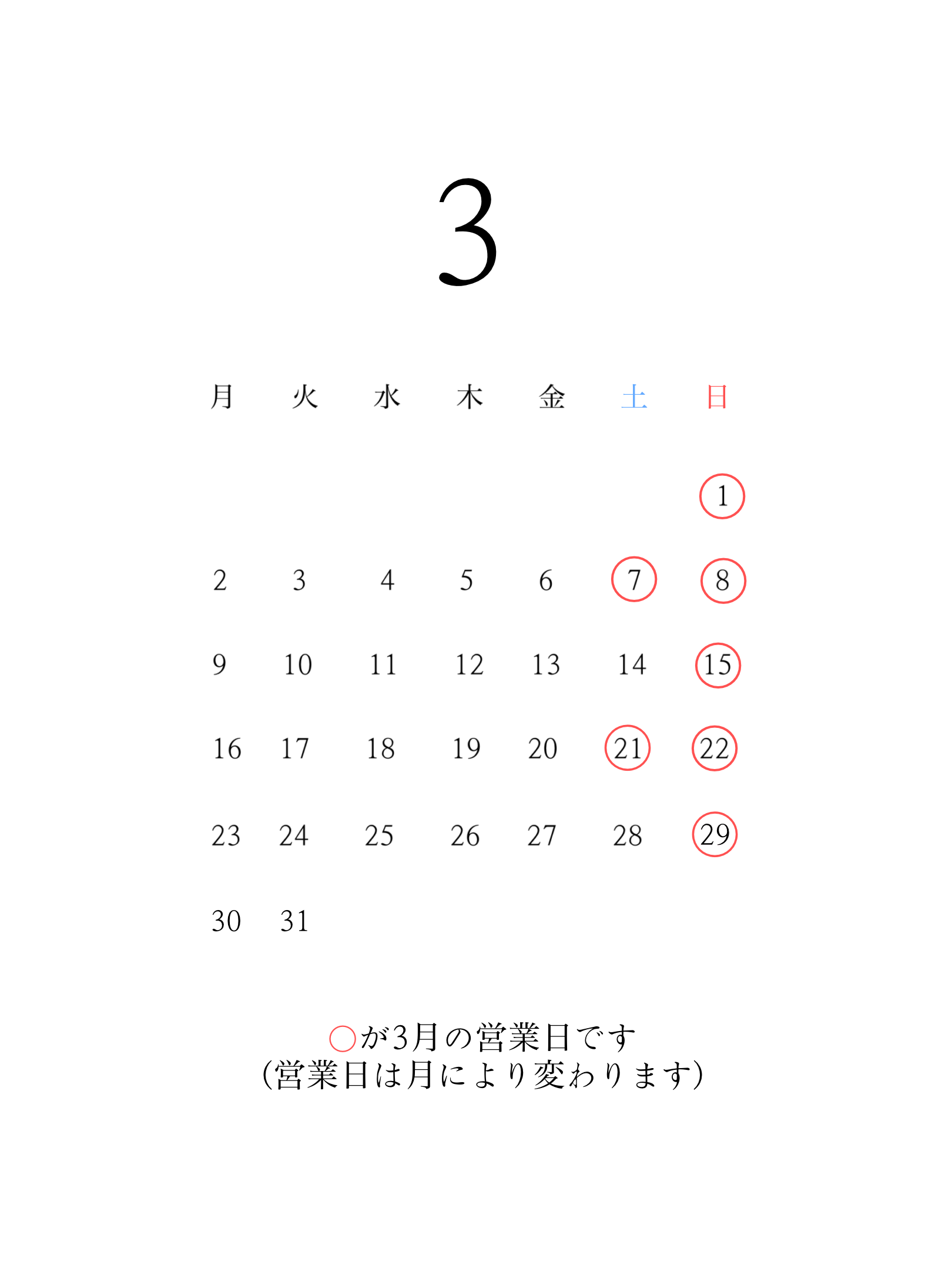 3月の営業日のお知らせ